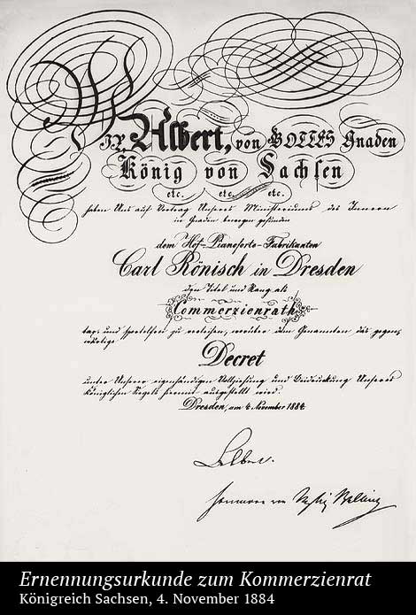 1884年,卡尔隆尼施被任命为皇室商务议员;之后在1890年他又被任命为瑞典皇室和挪威皇室的宫廷指定钢琴供应商。